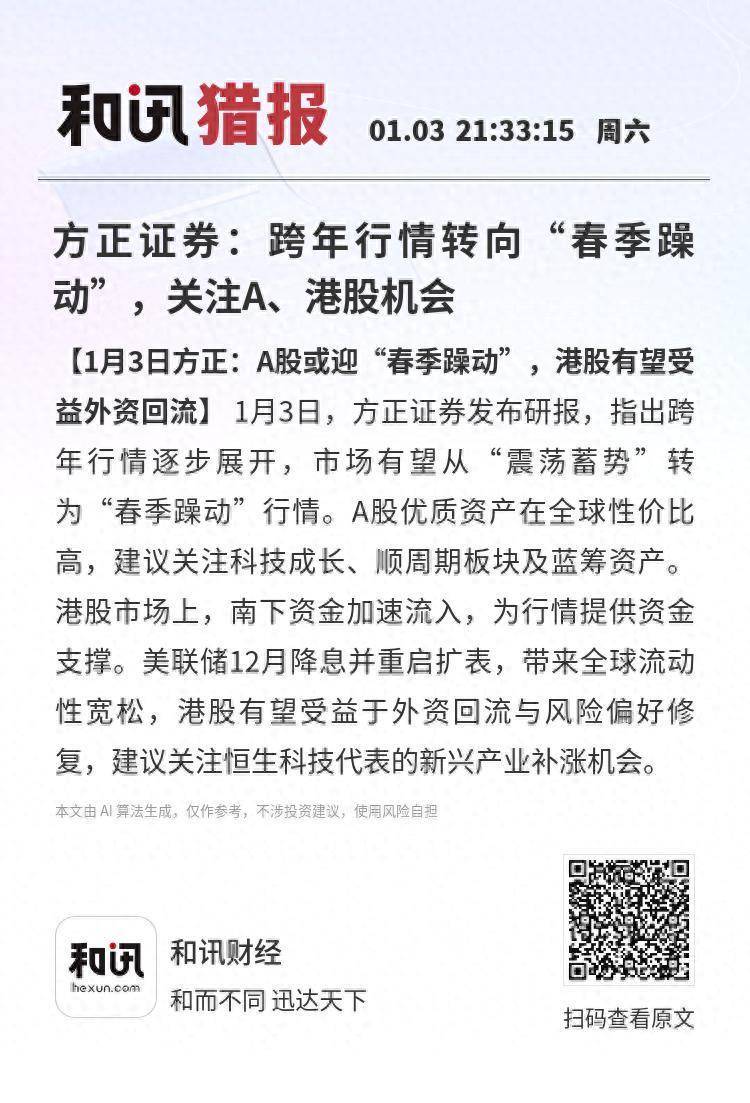 【1月3日方正:A股或迎“春季躁动”,港股有望受益外资回流】1月3日,方正证券发布研报,指出跨年行情逐步展开,市场有望从“震荡蓄势”转为“春季躁动”行情。A股优质资产在全球性价比高,建议关注科技成长、顺周期板块及蓝筹资产。港股市场上,南下资金加速流入多盈策略,为行情提供资金支撑。美联储12月降息并重启扩表,带来全球流动性宽松,港股有望受益于外资回流与风险偏好修复,建议关注恒生科技代表的新兴产业补涨机会。